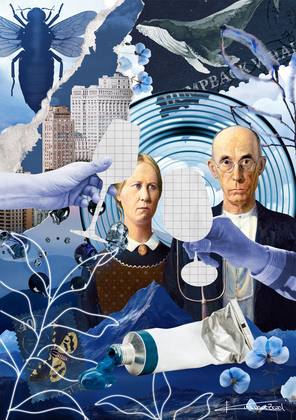 A mosaic of blue tones - deep, multi-layered, intense. Tradition and modernity meet in a timeless dance of art. The iconic figures of American Gothic enter a new dimension, not as a symbol of a country, but as a symbol of transition, of change. The architecture changes, structures interweave with the pulse of time.