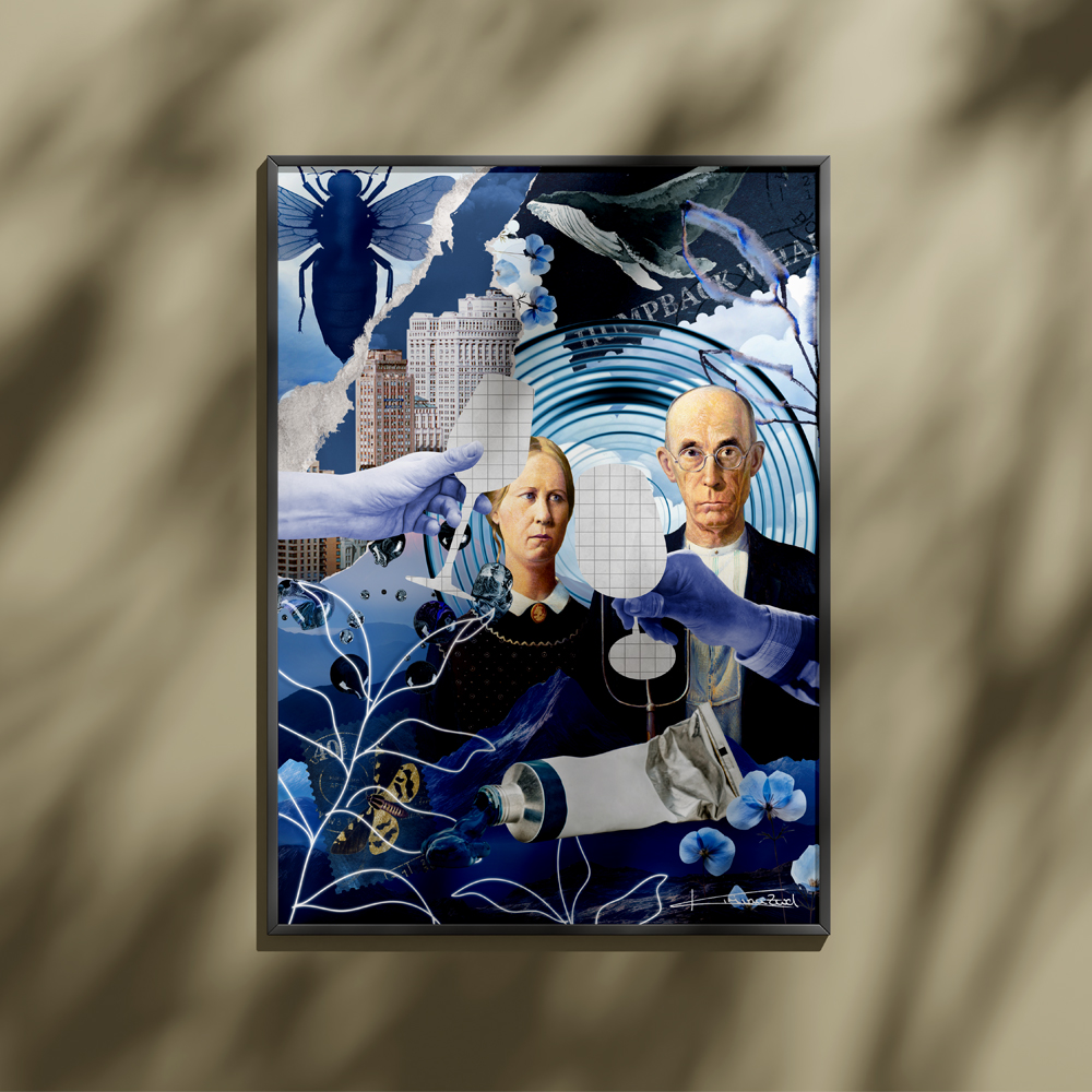 Ein Mosaik aus Blautönen – tief, vielschichtig, intensiv. Tradition und Moderne begegnen sich in einem zeitlosen Tanz der Kunst. Die ikonischen Figuren von American Gothic treten in eine neue Dimension ein, nicht als Symbol eines Landes, sondern als Sinnbild des Übergangs, der Veränderung. Die Architektur wandelt sich, Strukturen verweben sich mit dem Puls der Zeit.